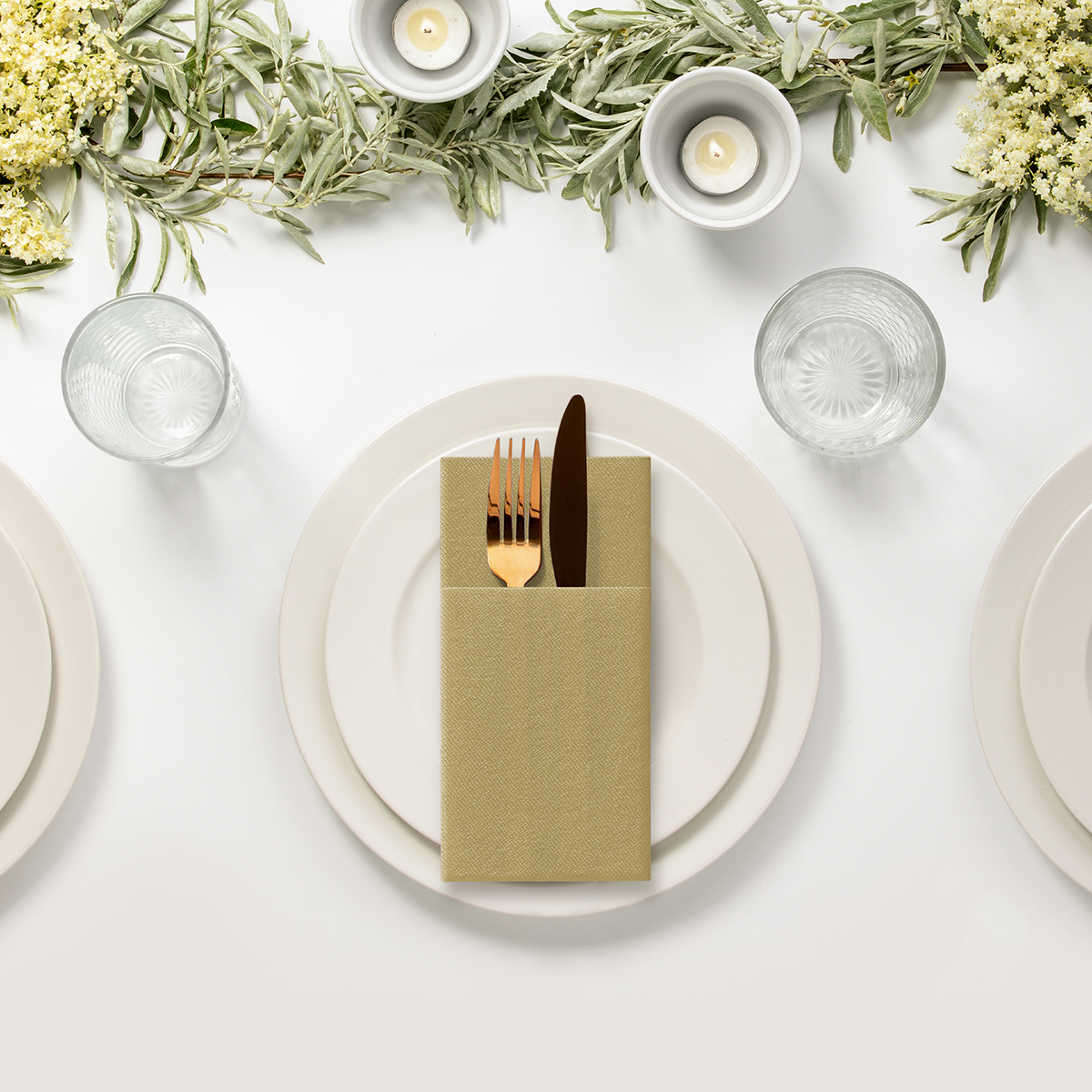 Higieniczne i wygodne kieszonki na sztućce. Szybkie i łatwe rozwiązanie ograniczające dotykanie zarówno sztućców, jak i serwetek. Przygotuj się, aby szybko nakryć stoły w godzinach szczytu. Świetne rozwiązanie do wnętrz i na zewnątrz.